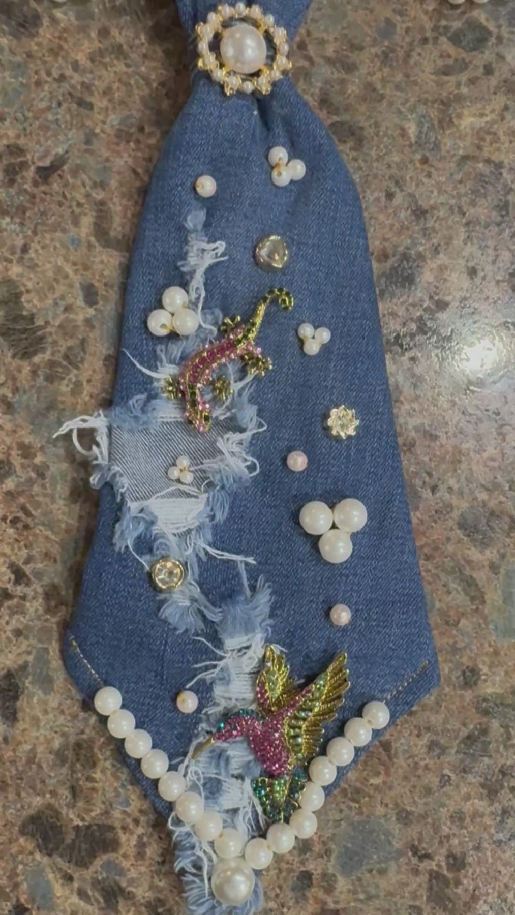 Turn heads with this one-of-a-kind statement piece that blends bold denim edge with timeless elegance. The Denim Luxe Pearl Collar Necklace features hand-frayed denim, sparkling rhinestones, and lustrous pearls delicately arranged along a tailored silhouette. Intricate jeweled hummingbird accents add a whimsical touch of artistry and color, symbolizing grace and individuality.