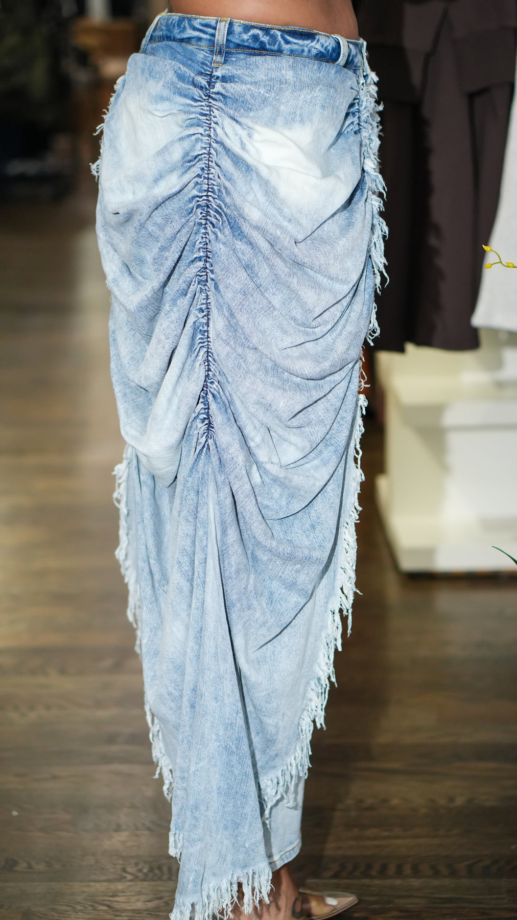 Make a bold entrance in the Draped over Fringe Jeans These statement jeans are crafted from light-wash denim with acid wash detailing and feature a high-rise fit, functional belt loops, exaggerated ruched fabric overlay panels that drape down the legs, and ultra-raw fringe trim detailing. Complete with a classic front zip fly, and a skinny leg silhouette. Style with a minimal top and let the pants do all the talking.