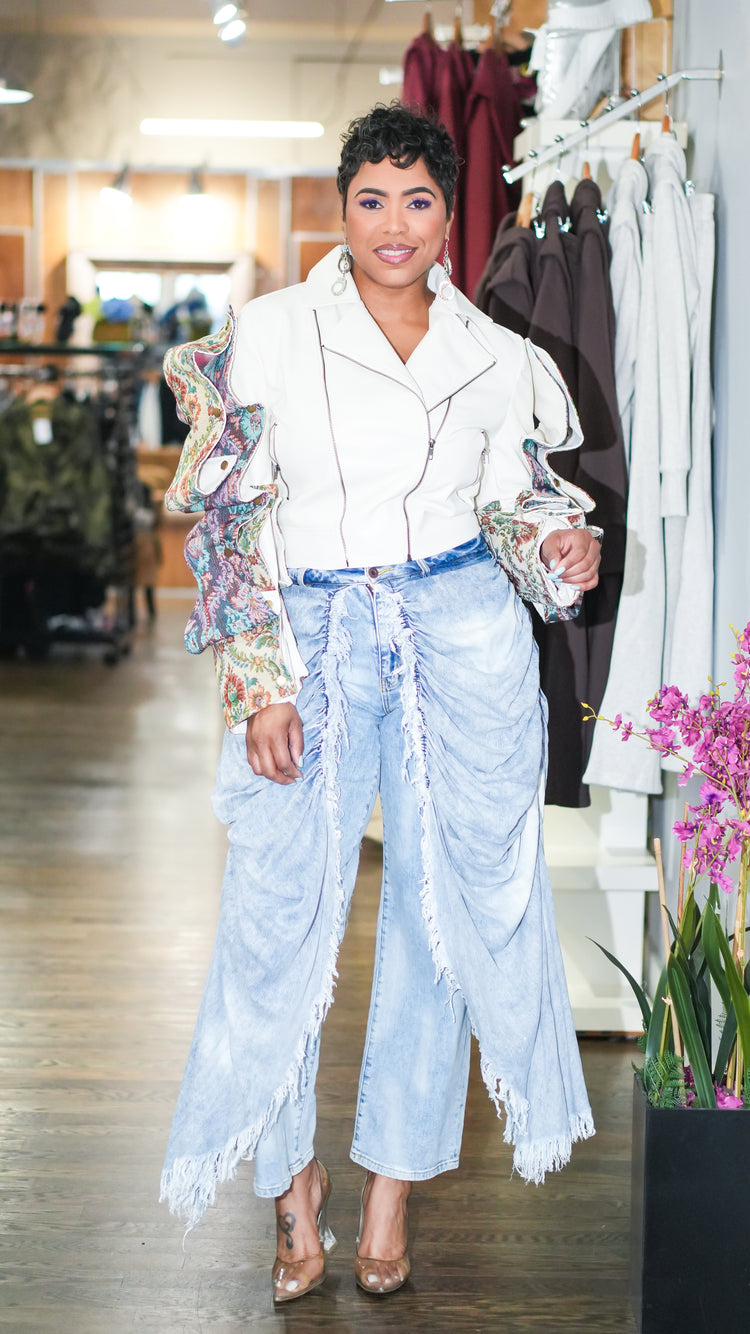 Make a bold entrance in the Draped over Fringe Jeans These statement jeans are crafted from light-wash denim with acid wash detailing and feature a high-rise fit, functional belt loops, exaggerated ruched fabric overlay panels that drape down the legs, and ultra-raw fringe trim detailing. Complete with a classic front zip fly, and a skinny leg silhouette. Style with a minimal top and let the pants do all the talking.