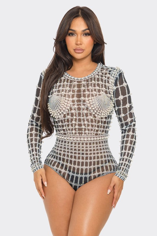 The Bring out the Pearls Embellished Bodysuit is adorned with rhinestones and pearls, adding an elegant touch. The mesh fabric and shell-shaped cup detail make for a stunning piece. With a back zipper for ease of wear, this bodysuit is made of 95% polyester and 5% spandex, with a 100% polyester lining.