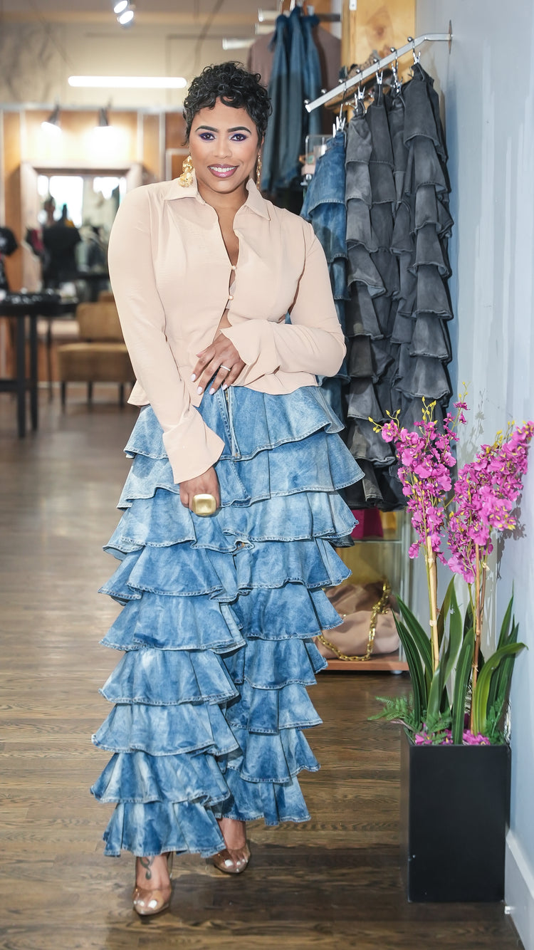 Our Drama Tiered Ruffle Denim Jeans bring bold runway energy to everyday style. Designed with dramatic layered ruffles and a flattering wide-leg silhouette, these statement jeans instantly elevate any outfit. The high-rise fit flatters your shape while semi-stretch cotton keeps you comfortable from brunch to late-night plans. Functional pockets keep it practical, but the statement style keeps it unforgettable.